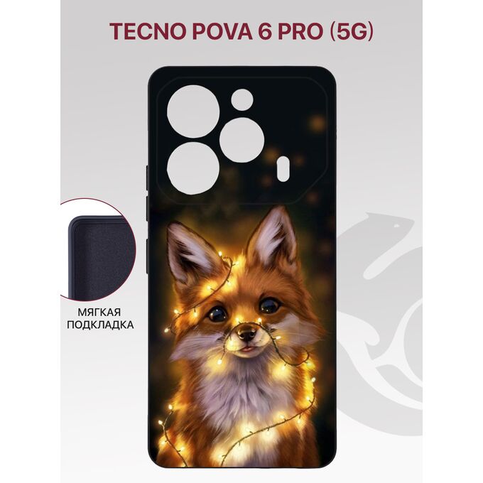 Чехол накладка Soft для Tecno Pova 6 Pro (5G), Pova 6 (4G) с рисунком, с защитой камеры, с мягкой подкладкой из микрофибры, противоударный, черный с принтом ЛИСА ОГНИ (Техно Пова 6 Про)