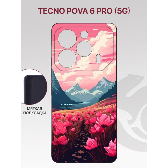 Чехол накладка Soft для Tecno Pova 6 Pro (5G), Pova 6 (4G) с рисунком, с защитой камеры, с мягкой подкладкой из микрофибры, противоударный, черный с принтом РОЗОВЫЙ ЗАКАТ (Техно Пова 6 Про)