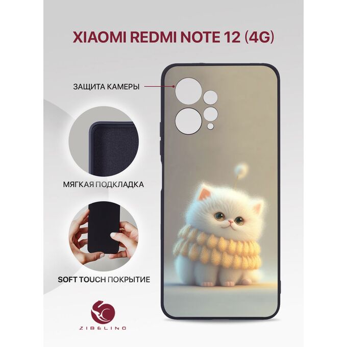 Чехол накладка Soft для Xiaomi Redmi Note 12 (4G) с рисунком, с защитой камеры, с мягкой подкладкой из микрофибры, противоударный, черный с принтом БЕЛЫЙ ПУШИСТИК (Ксиоми Редми Нот 12)