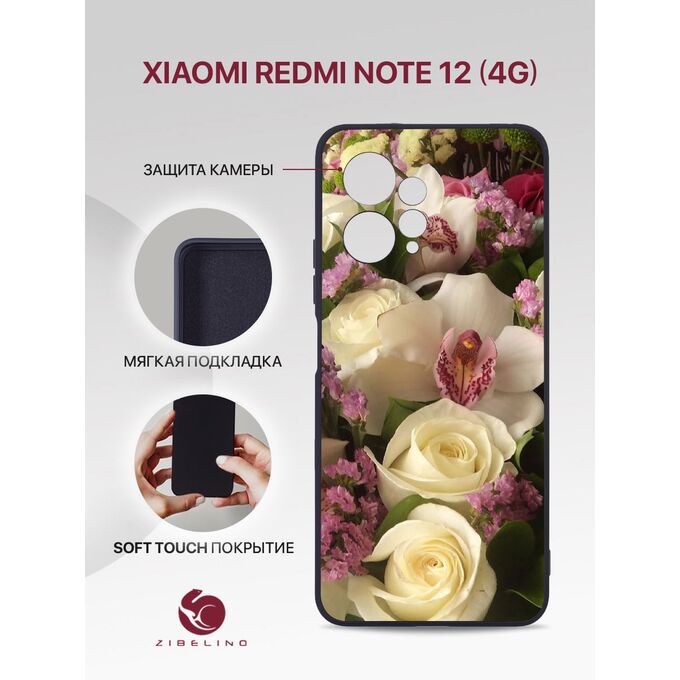 Чехол накладка Soft для Xiaomi Redmi Note 12 (4G) с рисунком, с защитой камеры, с мягкой подкладкой из микрофибры, противоударный, черный с принтом ЦВЕТОЧНАЯ СИМФОНИЯ (Ксиоми Редми Нот 12)