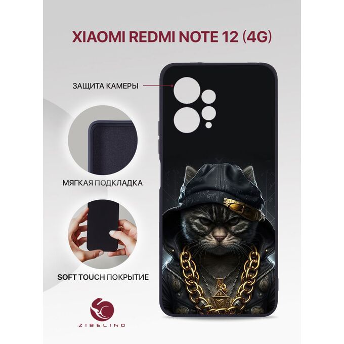 Чехол накладка Soft для Xiaomi Redmi Note 12 (4G) с рисунком, с защитой камеры, с мягкой подкладкой из микрофибры, противоударный, черный с принтом КОТ С ЦЕПЬЮ (Ксиоми Редми Нот 12)