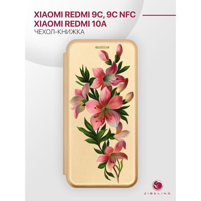 Чехол книжка Book для Xiaomi Redmi 9C, 10A с рисунком, с магнитом, золотистый, с принтом ЛИЛИЯ