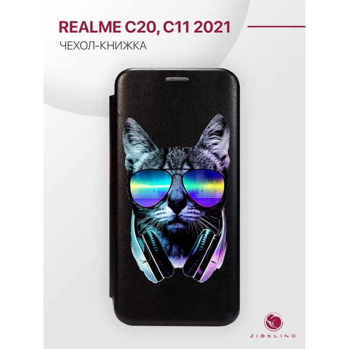 Чехол книжка для Realme C20, C11 2021 с рисунком, с магнитом, черный, с принтом КОТ-ДИДЖЕЙ 2