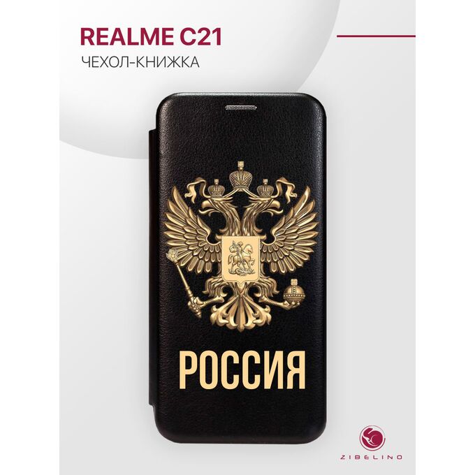 Чехол книжка для Realme C21 с рисунком, с магнитом, черный, с принтом РОССИЯ ОРЁЛ