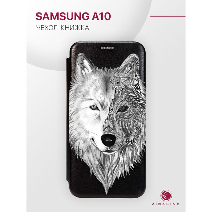 Чехол книжка для Samsung A10 с рисунком, с магнитом, черный, с принтом ВОЛК ОРНАМЕНТ