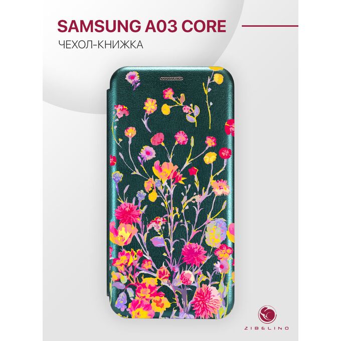 Чехол книжка для Samsung A03 Core с рисунком, с магнитом, изумрудный, с принтом ЦВЕТОЧНЫЙ ПРИНТ