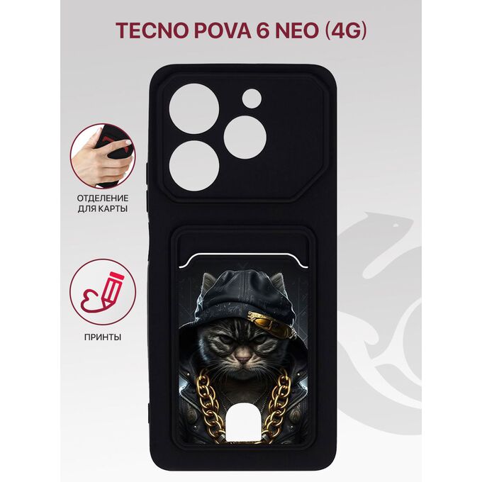 Чехол силиконовый Card Holder на Tecno Pova 6 Neo (4G) с карманом, покрытие силиконовый Card Holder-touch, с защитой камеры, черный с принтом (Техно Пова 6 Нео)