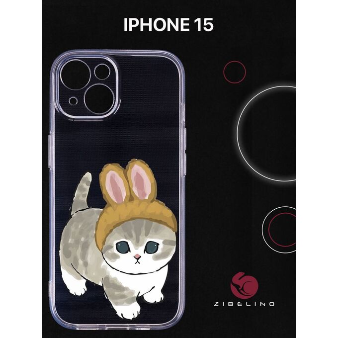 Чехол силиконовый для iPhone 15 прозрачный с рисунком, с защитой камеры, с принтом КОТИК С УШКАМИ (Айфон 15)