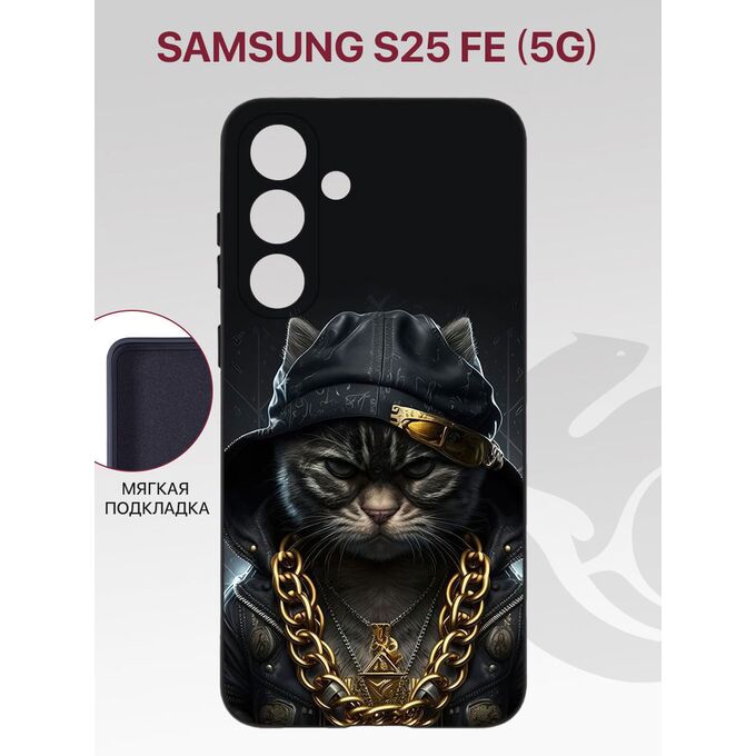 Чехол Soft для Samsung S25 FE Galaxy (5G) с рисунком, с защитой камеры, с мягкой подкладкой из микрофибры, противоударный, черный с принтом КОТ С ЦЕПЬЮ (Самсунг Галакси S25 FE (5G)