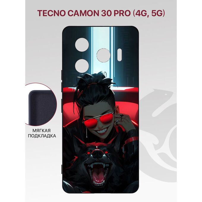 Чехол Soft для Tecno Camon 30 Pro (4G/5G) с рисунком, с защитой камеры, с мягкой подкладкой из микрофибры, противоударный, черный с принтом ДЕВУШКА ПЁС (Текно Камон 30 Про)