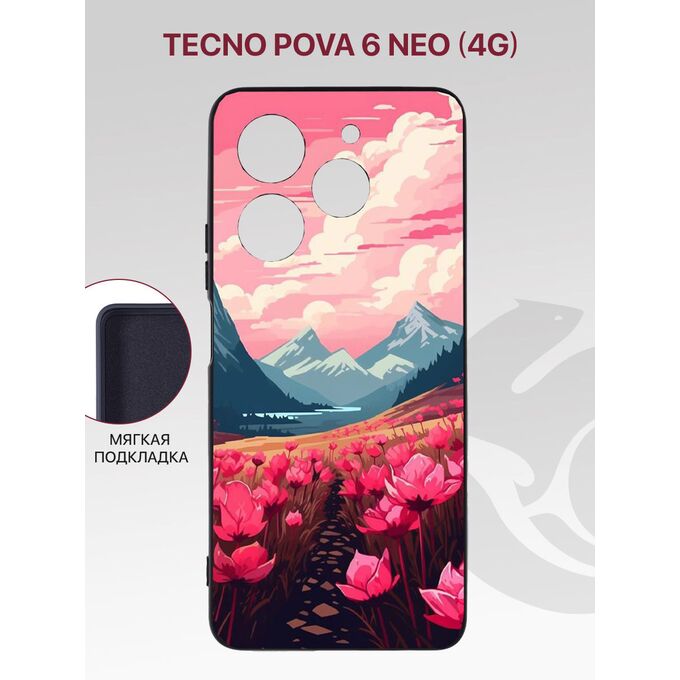 Чехол Soft для Tecno Pova 6 Neo (4G) с рисунком, с защитой камеры, с мягкой подкладкой из микрофибры, противоударный, черный с принтом РОЗОВЫЙ ЗАКАТ (Техно Пова 6 Нео)