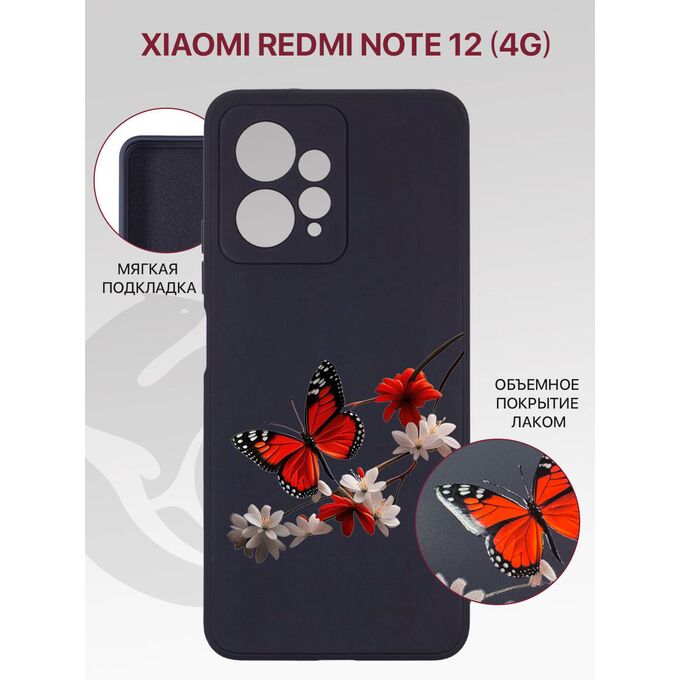 Чехол Soft для Xiaomi Redmi Note 12 (4G) лаковое покрытие с защитой камеры, с внутренней подкладкой из микрофибры, черный с принтом БАБОЧКИ ЛАК (Ксиоми Редми Нот 12)