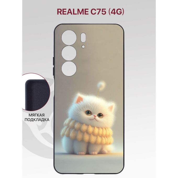 Чехол Soft на Realme C75 (4G) с рисунком, с защитой камеры, с мягкой подкладкой из микрофибры, противоударный, черный с принтом БЕЛЫЙ ПУШИСТИК (Реалми С75)