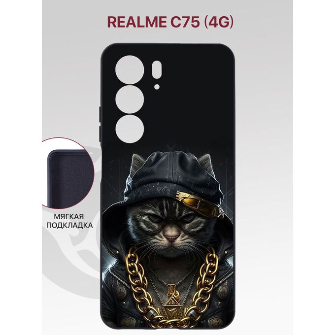 Чехол Soft на Realme C75 (4G) с рисунком, с защитой камеры, с мягкой подкладкой из микрофибры, противоударный, черный с принтом КОТ С ЦЕПЬЮ (Реалми С75)
