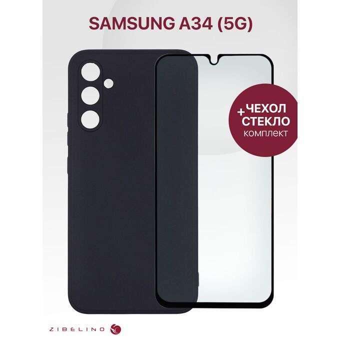 Чехол + Стекло (Комплект 2 в 1) для Samsung A34 (5G) (A346) с защитой камеры, с мягкой подкладкой из микрофибры, противоударный, черный (Самсунг Галакси А34 А346)