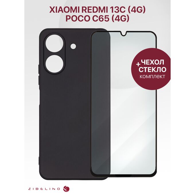 Чехол + Стекло (Комплект 2 в 1) для Xiaomi Redmi 13C, Poco C65 (4G) с защитой камеры, с мягкой подкладкой из микрофибры, противоударный, черный (Ксиоми Редми 13С, Поко С 65)