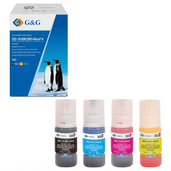 Чернила G&G GG-101BKCMY-45ml*4 101BKCMY голубой/пурпурный/желтый/черный набор 4x45мл для Epson EcoTank L4150/L4156/L4160/L4250/L4260/L4266/L6160/L6170
