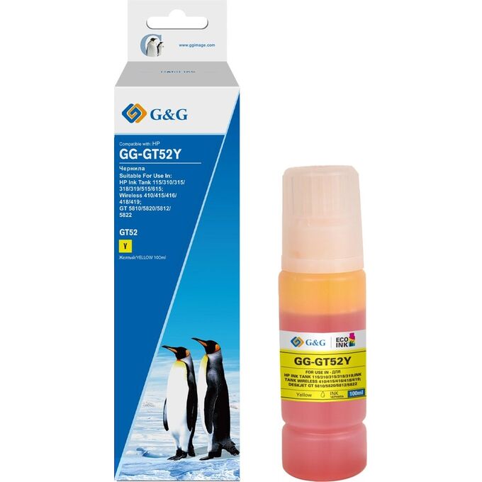 Чернила G&G GG-GT52Y желтый100мл для HP Ink Tank 110/115/116/118/310/315/316/318/319