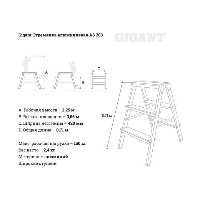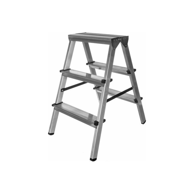 Стремянка Gigant - это раскладная лестница, предназначенная для хозяйственных нужд и ремонтных работ на высоте до 2,25 м. Надежная конструкция состоит из двух секций по 3 ступени. Высота площадки составляет 0,66 м.
