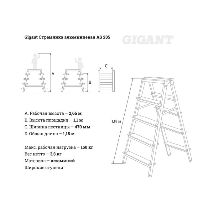 Стремянка Gigant - это раскладная лестница, предназначенная для хозяйственных нужд и ремонтных работ на высоте до 2,66 м. Надежная конструкция состоит из двух секций по 5 ступеней. Высота площадки составляет 1,1 м.