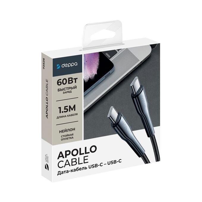 Дата-кабель Apollo USB-С - USB-С, 60Вт, 1,5м, черный, Deppa