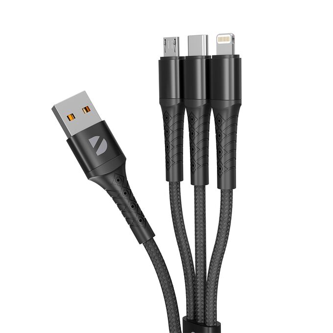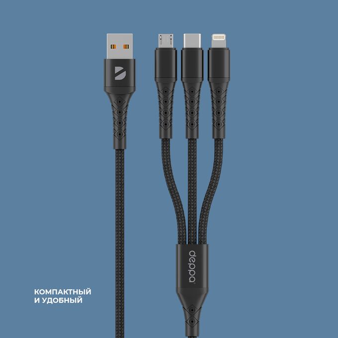 3 в 1 кабель от Deppa позволит вам сэкономить пространство на вашем рабочем столе. Кабель объединяет на одном конце три наиболее популярных коннектора — micro-USB, Type-C и Lightning. Другой конец кабеля оснащен распространенным коннектором USB-A, что делает его совместимым с большинством современных СЗУ. Оплетка выполнена из гибкого и износостойкого нейлона. Для кабеля выбрана длина 1.2 м, обеспечивающая комфортную эксплуатацию. Кабель 3 в 1 поддерживает высокую скорость передачи данных до 480 Мбит/сек и экономит ваше время!