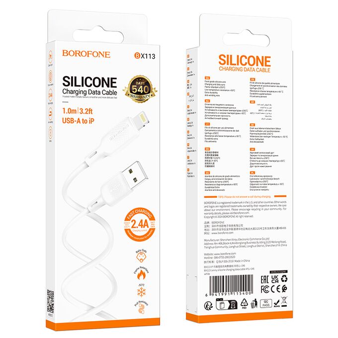 Дата-кабель BOROFONE BX113 Lenny silicone charging data cable iP(L=1M) (белый)