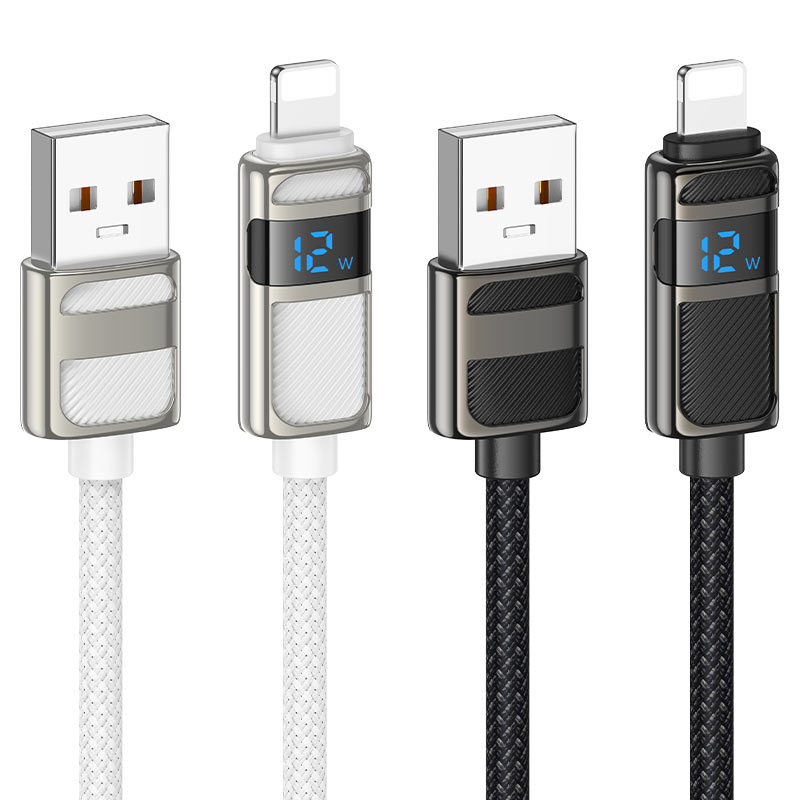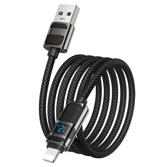 U137 Line, USB на iP зарядный дата кабель, ток до 2.4A, LED цифровой дисплей, нейлоновая оплётка и коннекторы из цинкового сплава, длина – 1.2м
