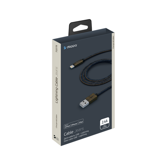 Дата-кабель Jeans USB - Lightning, медь/джинса, MFI, 1.2м, синий, Deppa, 72275