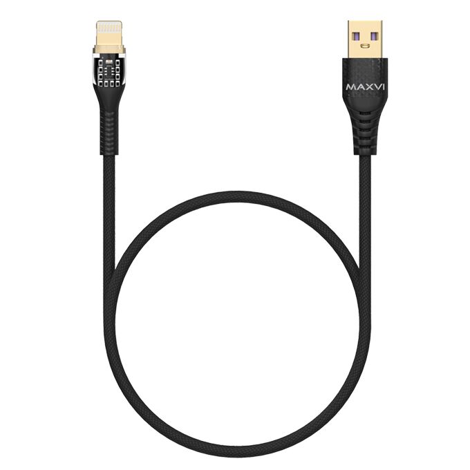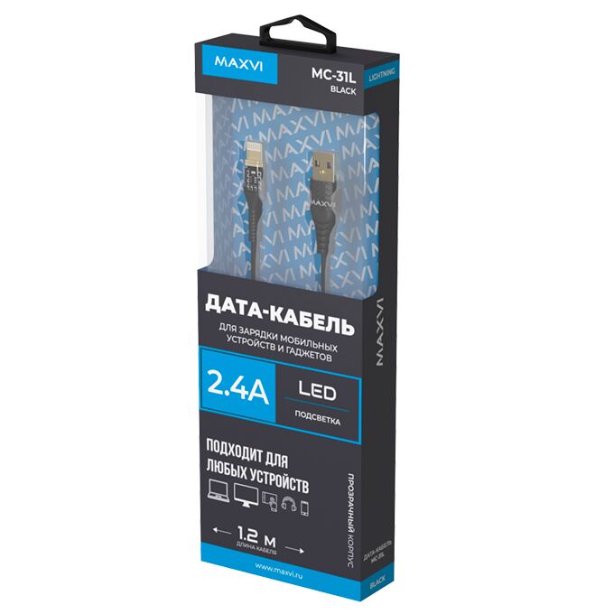 Дата-кабель Maxvi MC-31L USB-Lightning 2.4А, прозрачный корпус, LED подсветка, 1.2м, black
