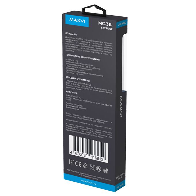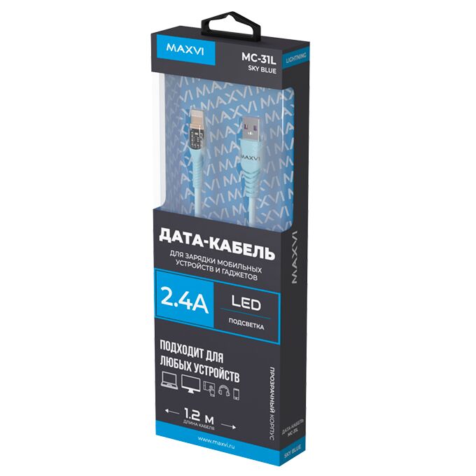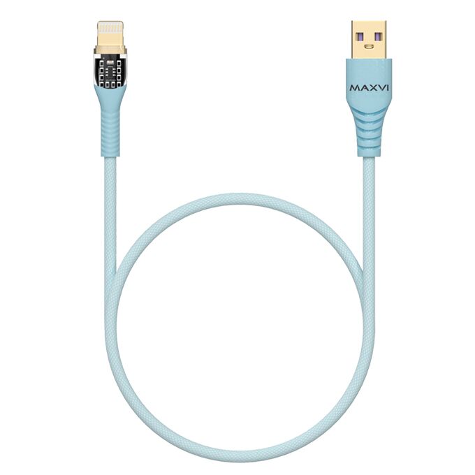Дата-кабель Maxvi MC-31L USB-Lightning 2.4А, прозрачный корпус, LED подсветка, 1.2м, sky blue
