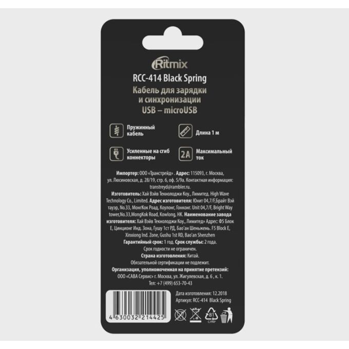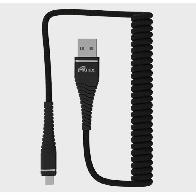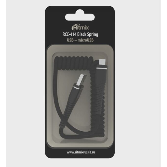 Дата-кабель Ritmix RCC-414 USB - MicroUSB 2 А, 1м, пружинный, блистер, черный