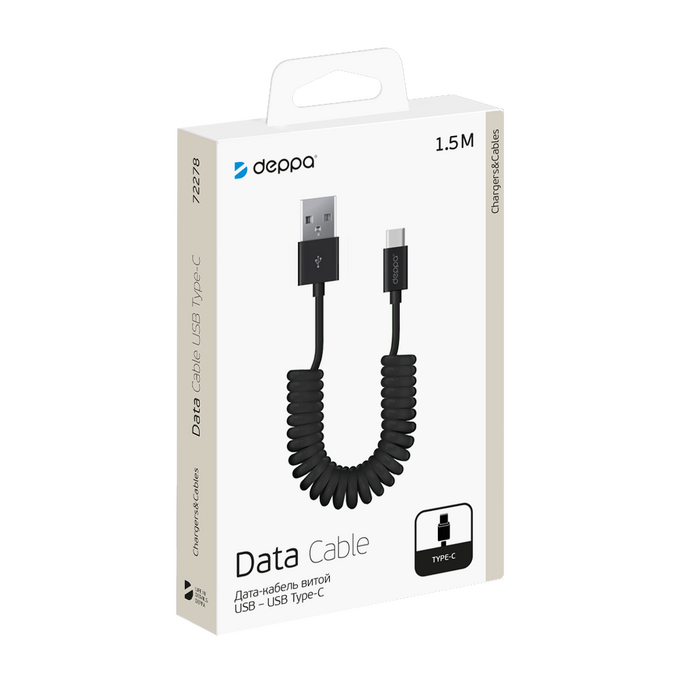 Дата-кабель USB - Type-C, витой, 1.5м, черный, Deppa