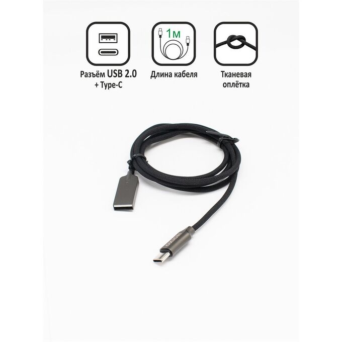 Дата-кабель USB2.0 - Type-C 1м. Металлический коннектор, тканевая оплетка. Кабель можно подключить как к адаптеру для зарядки, так и к порту USB на компьютере для синхронизации и подзарядки.