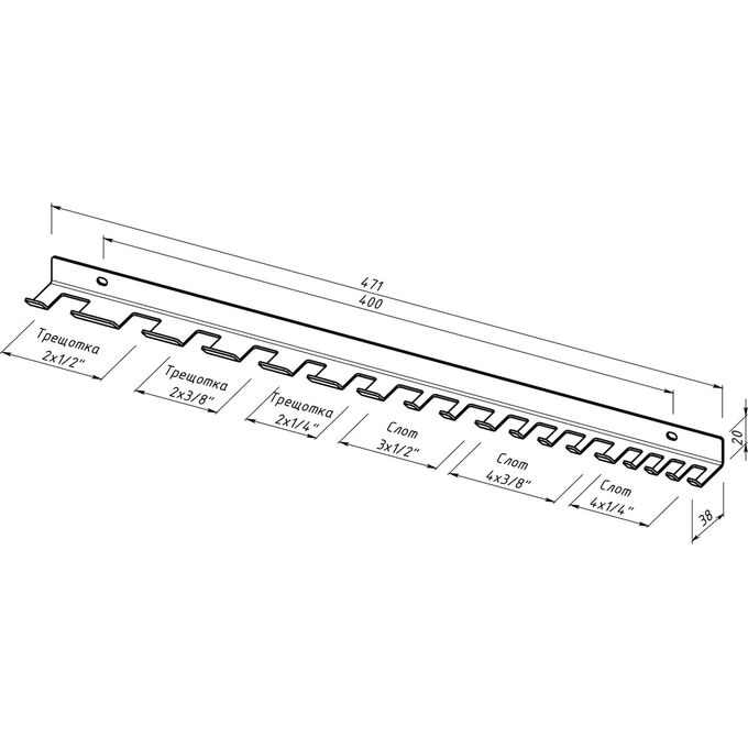 Держатель имеет продуманную конструкцию, предусматривающую 2 посадочных места для хранения трещоточного ключа размером квадрата 1/2, 2 посадочных места для ключа 3/8, а также 2 посадочных места под трещотки 1/4. Дополнительно изделие оснащено слотами под стандартные удлинители для торцевых головок на 1/2 – три слота, 3/8 – четыре слота и 1/4 – четыре слота.