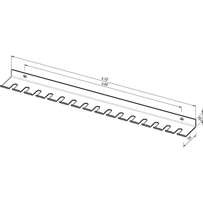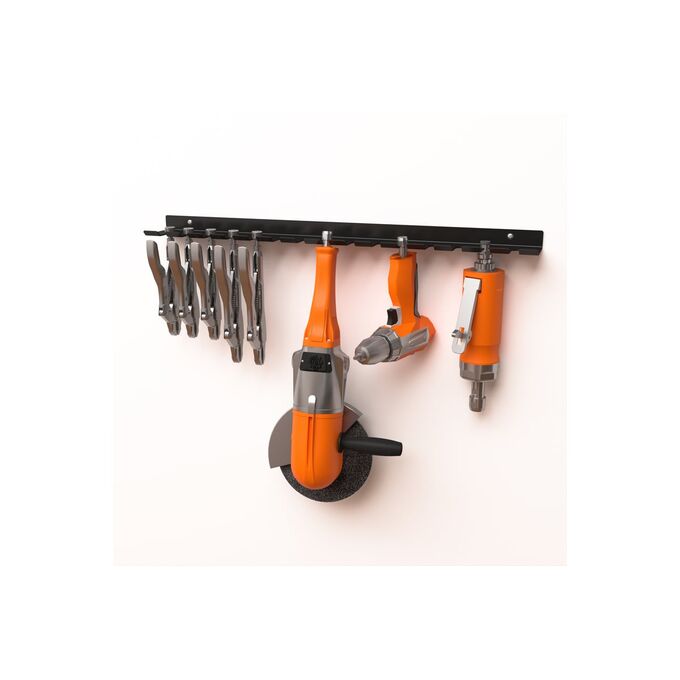 Держатель имеет продуманную конструкцию, предусматривающую 15 мест для хранения различных пневматических инструментов, а также возможность разместить: ручные зажимы для сварочных работ, фиксация и удержание которых осуществляется за зажимной болт М8/М10.