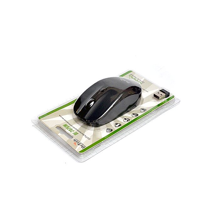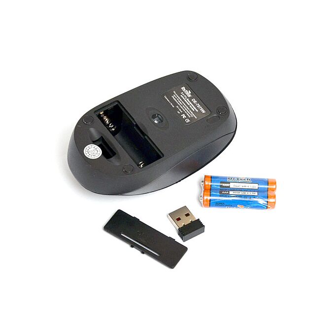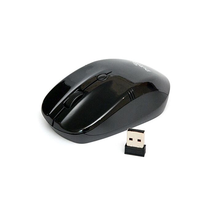2.4ГГц беспроводная оптическая мышь, 3 кнопки + колесо прокрутки, 1200 dpi, источник питания: 2хААА, радиус действия до 10 м., Нано-приемник, совместимость: Win Vista/7/8/10 and Mac OS 8.6, цвет черный, размеры 113х58х30 мм.