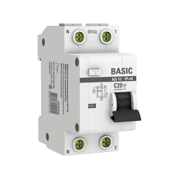 Дифавтомат EKF Basic АД-12 (DA12-20-30-bas) 1P+N 20А 30мА тип АС х-ка C эл. 4,5кА