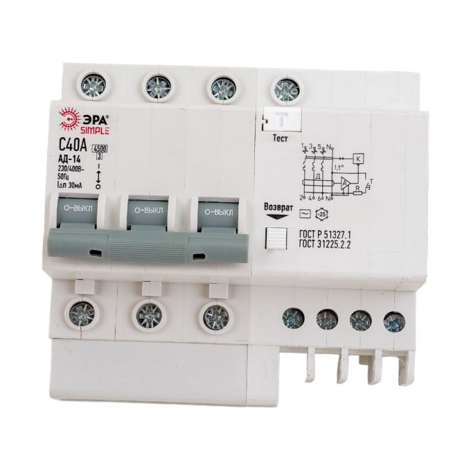 Автоматический выключатель дифференциального тока ЭРА SIMPLE 3P+N 40А 30мА тип АС Б0039297 предназначен для защиты человека от поражения электрическим током при повреждении изоляции электроустановок, для предотвращения пожаров вследствие протекания токов утечки на землю и для защиты от перегрузки и короткого замыкания. Рекомендуются для защиты групповых линий, питающих розетки наружной установки, розеток и освещения подвалов и гаражей.