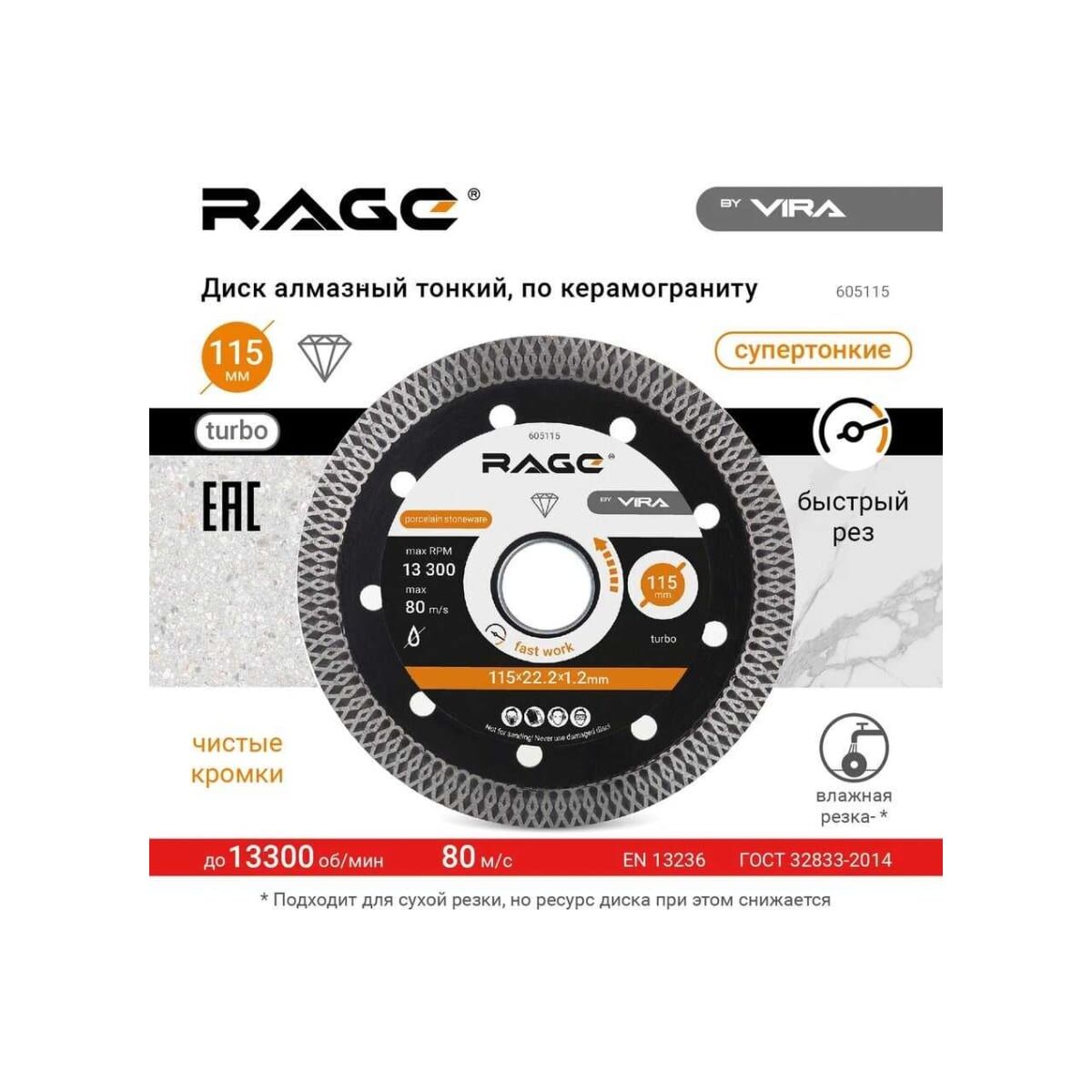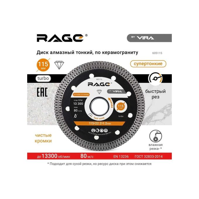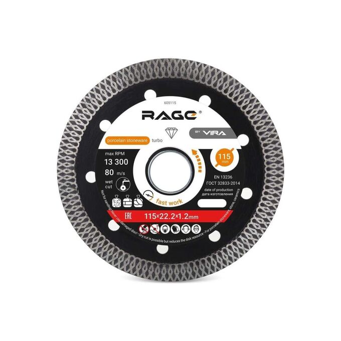 Диск алмазный тонкий по керамограниту RAGE VIRA 605115 предназначен для угловых шлифмашин (болгарок).