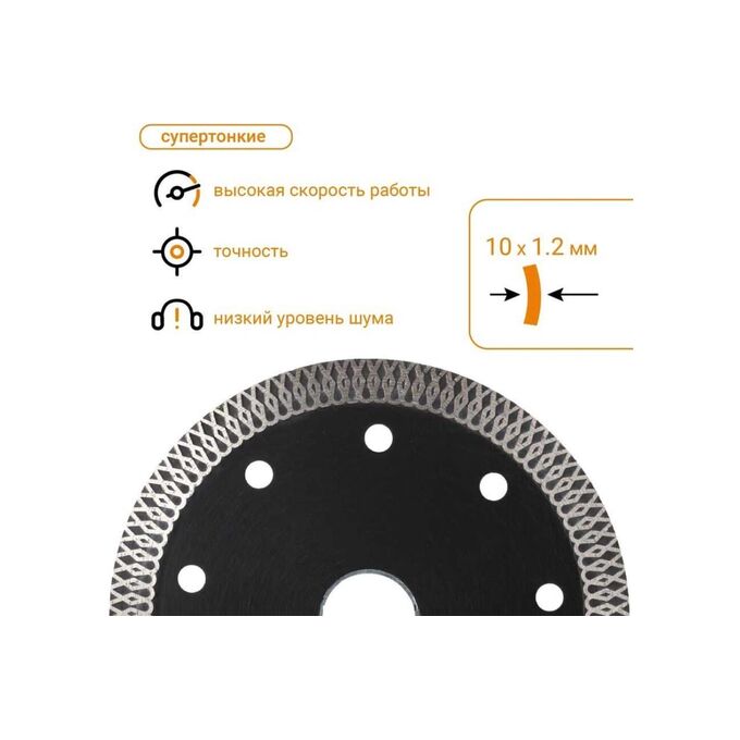 Диск имеет высокую концентрацию алмазов мелкой фракции, а также минимально возможную толщину в 1.2 мм, что обеспечивает высокую скорость реза и повышенную чистоту кромок.