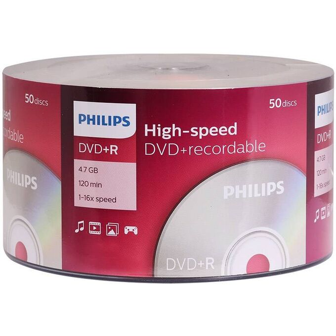DVD+R PHILIPS – это компактный и надежный способ хранения информации. Сбалансированная структура диска обеспечивает устойчивость записи и чтение информации на высоких скоростях. Отлично подходят для хранения любой информации. DVD+R-диски для однократной записи цифровой информации. Поставляются в упаковке на шпиле (Cake box). Тип диска – DVD+R. Емкость диска – 4,7 Gb. Скорость записи – 16x. Количество дисков в упаковке – 50 шт.