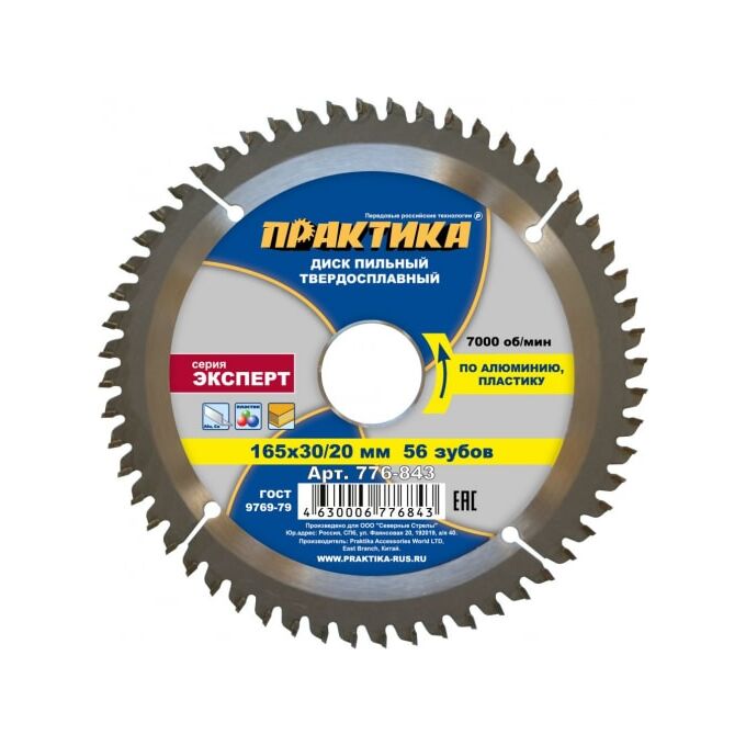 Диск пильный твёрдосплавный по алюминию Практика 165 х 30/20 мм (776-843) 56 зубов