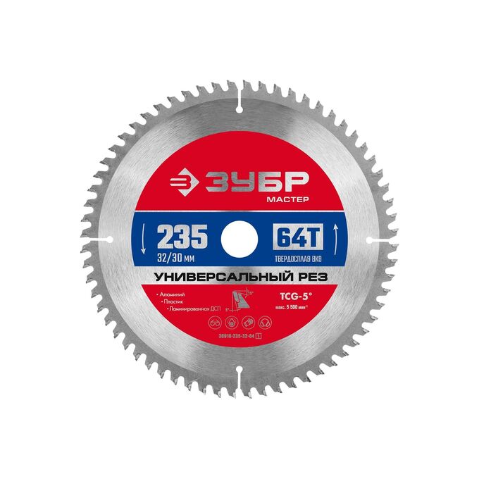 Технические характеристики пильного диска по алюминию ЗУБР 36916-235-32-64_z01