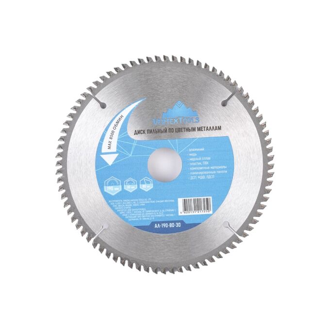 Диск пильный по цветным металлам и пластику (190x30 мм; Z=80) vertextools АЛ-190-80-30 предназначен для циркулярных и торцовочных пил. Используется для работ по алюминию, меди, пластику, композитным материалам и ламинированным панелям.
