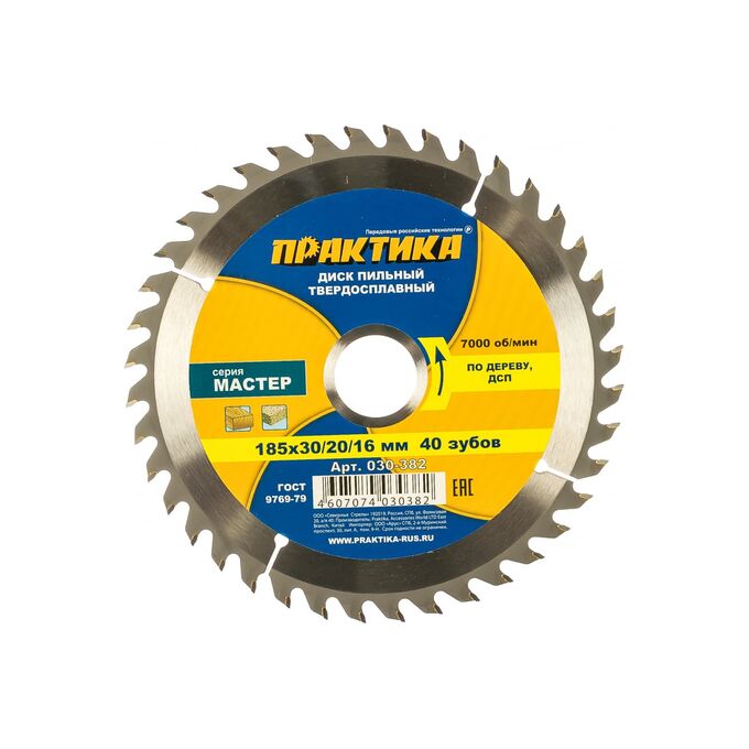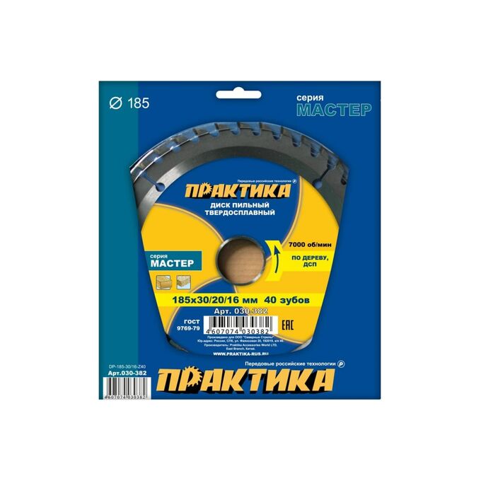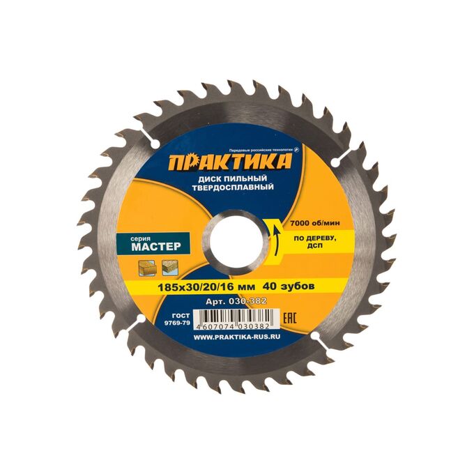 Диск пильный по дереву, ДСП Практика 185 х 30/20/16 мм (030-382) 40 зубов