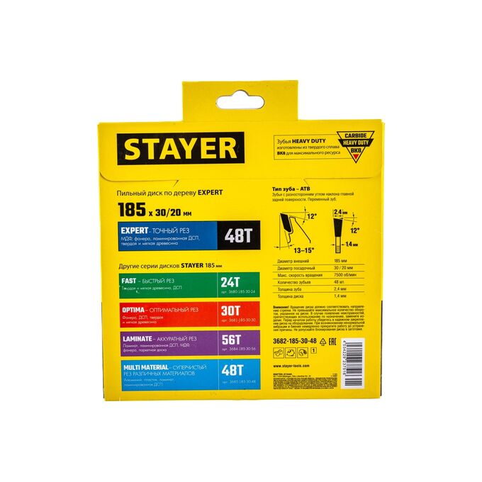 Диск пильный по дереву, точный рез STAYER Expert 3682-185-30-48_z01 185 x 30/20мм 48Т