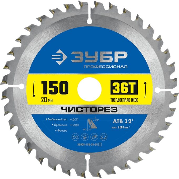 Диск пильный по дер. Зубр 36905-150-20-36_z01 d-150мм d(посад.)-20мм (циркулярные пилы) (упак.:1шт)