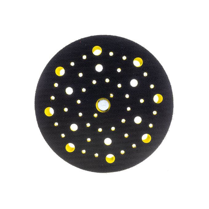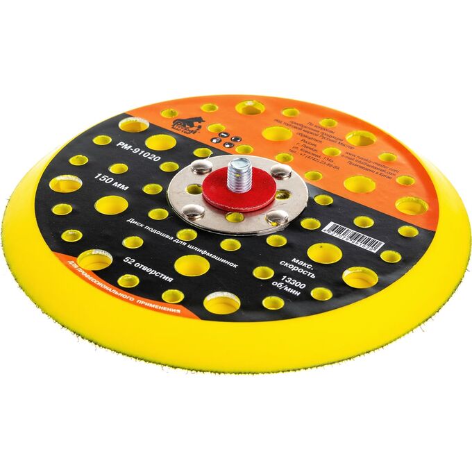 Дисковая подошва для шлифовальных машинок (150 мм; 52 отверстия; 5/16" x 24 мм) Русский Мастер РМ-91020 может использоваться с кругами на 6, 7, 9 и 15 отверстий, благодаря универсальному расположению 52 отверстий на диске.