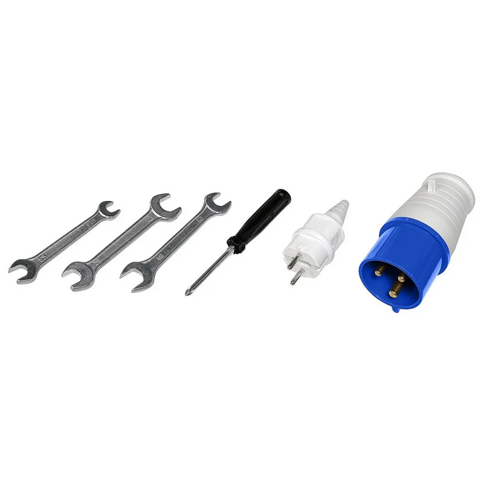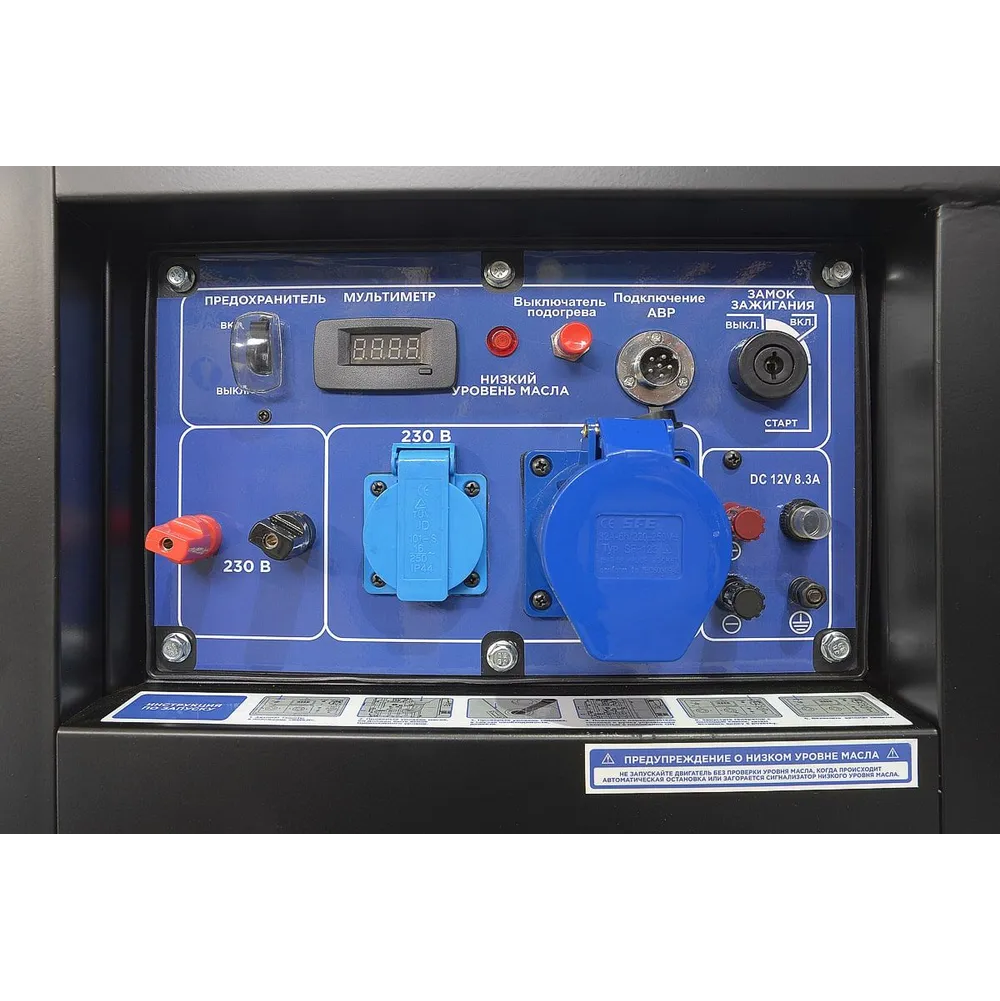 8.Розетки: 220В – 16А 1 шт.(европейского стандарта) и 220В - 32А 1 шт.(промышленная), что позволяет подключать разные электроинструменты